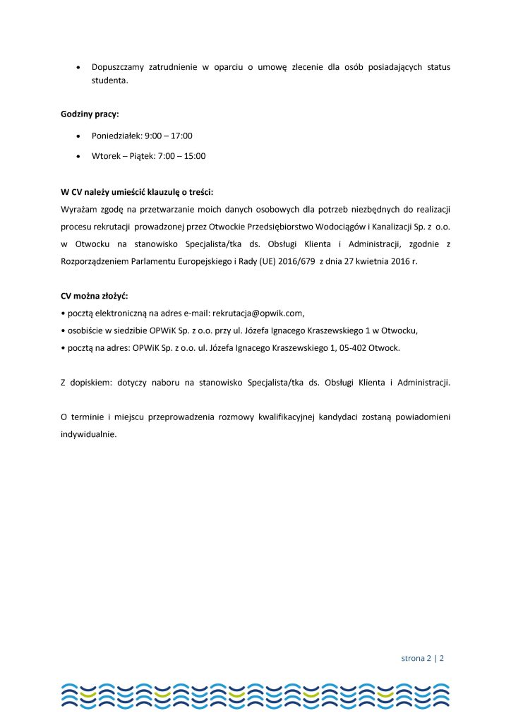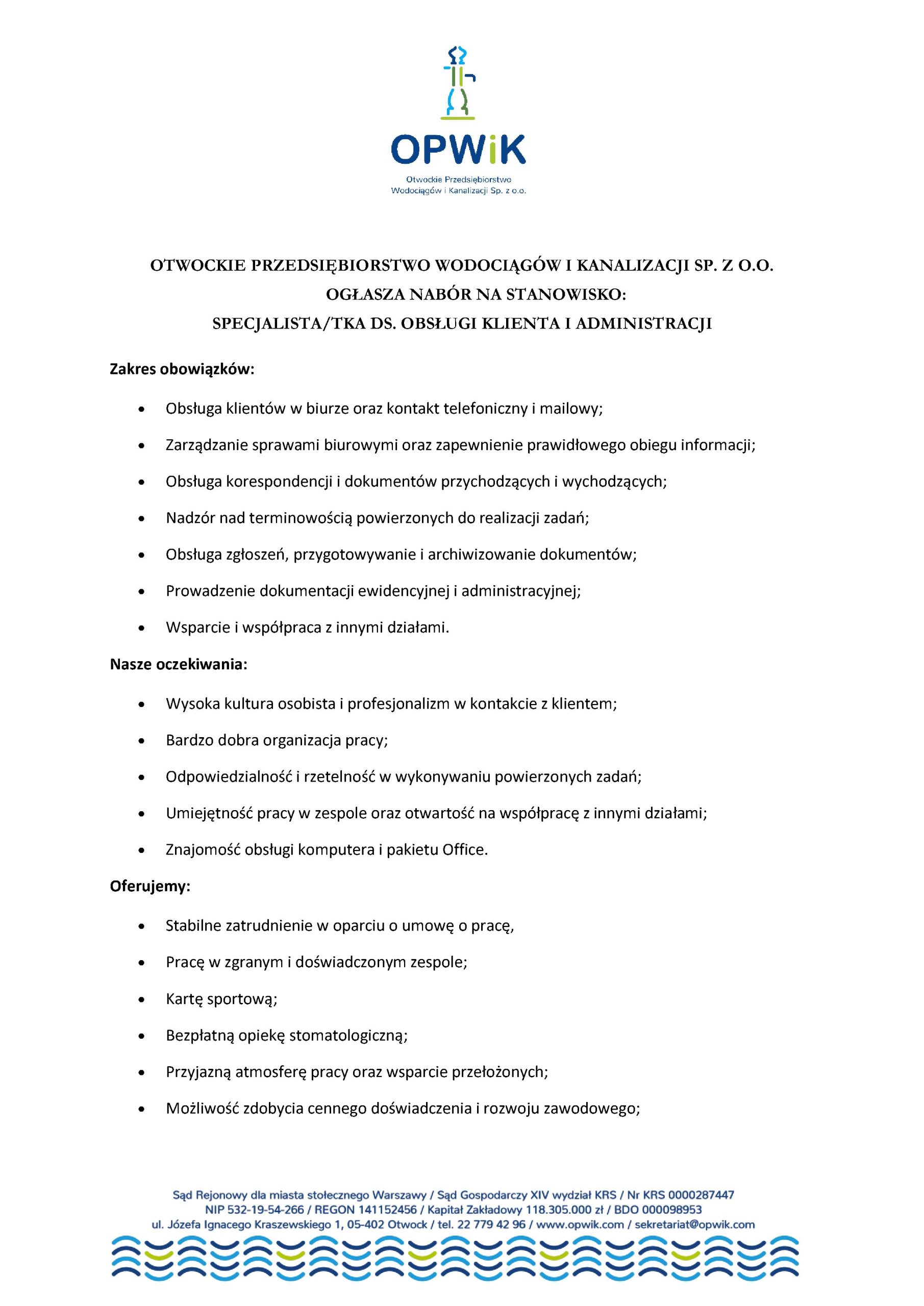 Zapraszamy do wzięcia udziału w rekrutacji na stanowisko Specjalista/tka ds. Obsługi Klienta i Administracji. Szczegółowe informacje dotyczące naboru oraz klauzulę informacyjną znajdą Państwo w dokumentach zamieszczonych poniżej.
